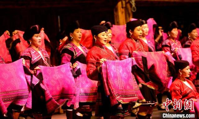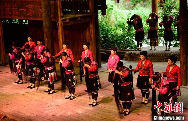 9月26日,在广西桂林市龙胜各族自治县龙脊镇黄洛瑶寨歌舞场,瑶族群众在表演长发梳妆。 潘志祥 摄