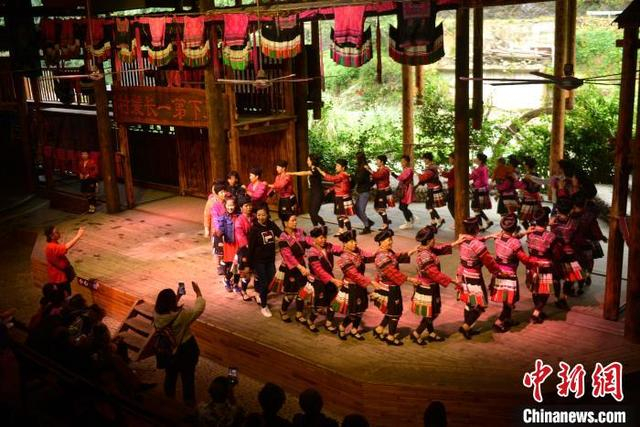 9月26日,在广西桂林市龙胜各族自治县龙脊镇黄洛瑶寨歌舞场,游客在观看民俗表演。 潘志祥 摄