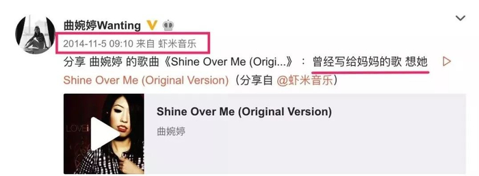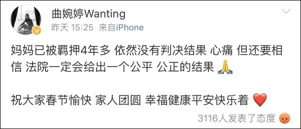 有人考古曲婉婷的微博发现,在她妈妈被带走的大半年里,曲只在2014年11月的时候发过一次想妈妈,但是后面配了自己的新歌宣传......