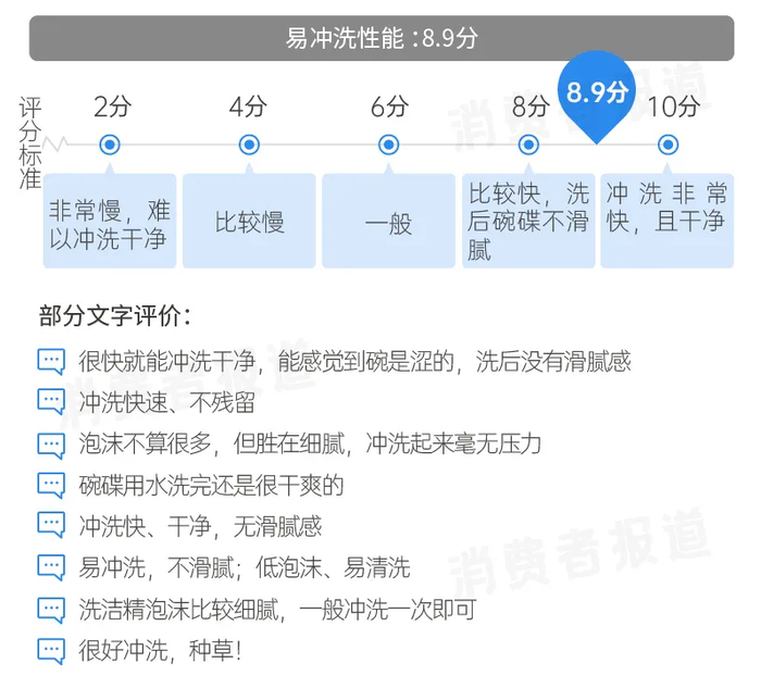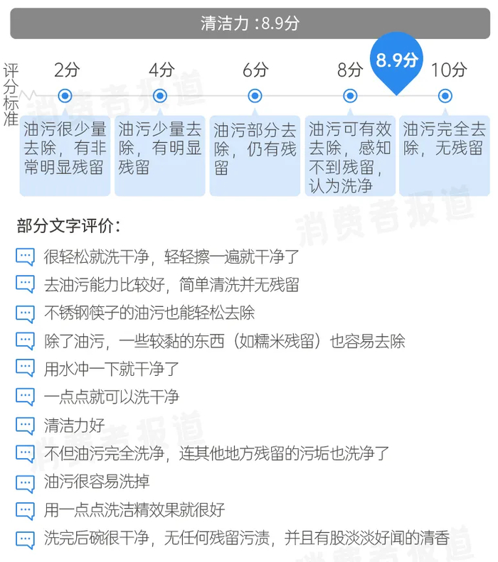 2020年8月《消费者报道》选取了主打“无油餐洗科技”的蓝月亮天露餐具·果蔬洁净精华进行测评,招募了20名志愿者在家动手试用了这款浓缩洗洁精,体验它的去油、去污功能。在这轮主观测评中,清洁力的主观评分为8.9分,许多志愿者使用后表示“油污很容易洗掉”“除了油污,一些较黏的东西(如糯米残留)也容易去除”。由此可见,天露洁净精华去油效率很高,即便是简单擦拭,也可以快速去除油污。