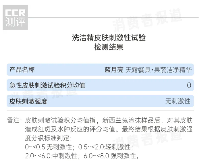 《消费者报道》皮肤刺激性试验结果显示,蓝月亮天露餐具·果蔬洁净精华的急性皮肤刺激实验积分均值为0,根据皮肤刺激强度标准,结论为无刺激性,即不会对皮肤造成刺激。