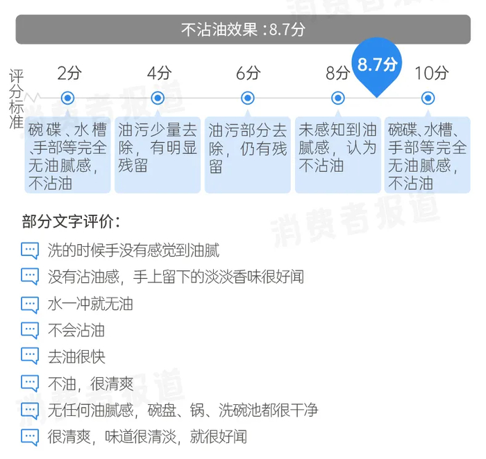 《消费者报道》参与体验的志愿者多数表示天露洁净精华“没有沾油感,手上留下的淡淡香味很好闻”“无油腻感,洗后洗碗池都很干净”“洗的时候手没有感觉到油腻”等。