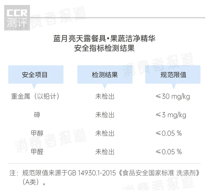 《消费者报道》的测评数据显示,天露洁净精华的易冲洗性能为8.9分,消费者使用反馈普遍是“冲洗快速,不残留”,同时《消费者报道》根据国标GB 14930.1-2015《食品安全国家标准洗涤剂》对A类产品(直接用于清洗食品的洗涤剂)的安全要求,检测了天露洁净精华的重金属、砷、甲醇以及甲醛含量,结果显示均未检出,成分安全通关。证明天露洁净精华符合国家A类标准的食品用洗洁精,可以安心用于餐具果蔬清洗。