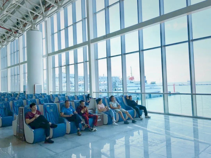 通过验票闸口,往前走便可看到一个近似半圆形的大型玻璃窗,透过玻璃窗便可窥见外面的一抹碧海蓝天。