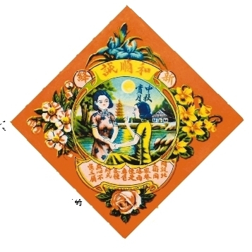 另一张是商号为“和顺诚”的月饼包装纸,这张月饼包装纸是十几年前一位藏友送的,底色为红色,上面彩印的图案内容丰富,只见交错的圆圈上方,有黄底红色楷书“和顺诚”三个大字,“和顺诚”两边各有一小黑圆圈,里面分别写有“新”“绛”两个红字,表明其产地为新绛。“和顺诚”下面一轮橙黄的圆月高悬空中,圆月右边,有黑色的行书“中秋赏月”四字。圆月之下,绿树葱葱、宝塔耸立、粉墙黛瓦、湖水荡漾,两名身着旗袍的美女沐浴着月光,一边赏月,一边手拉着手侃侃而谈。两美女下方,有用红字竖写的“开设北大街陶家巷路西便是专售各种时式点心不损主顾”的广告词,广告词下有一行黑色小字“天津锅店街金店胡同商益印刷所印”,表明了印刷厂家的地址。美女图案四周,点缀着各色花卉,衬托出中秋花好月圆、其乐融融的美好意境。这张月饼包装纸,构图饱满,设计精巧,时代特色鲜明,极具视觉冲击力。