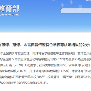 根据《教育部办公厅关于做好2020年全国青少年校园篮球、排球特色学校遴选等工作的通知》、《教育部办公厅关于做好全国青少年校园冰雪运动特色学校及北京2022年冬奥会和冬残奥会奥林匹克教育示范学校遴选工作的通知》要求,在有关单位自主申报、省级教育行政部门推荐、专家遴选,教育部拟认定篮球体育传统特色学校2687所,排球体育传统特色学校1425所,冰雪体育传统特色学校1027所,北京2022年冬奥会和冬残奥会奥林匹克教育示范学校208所,校园篮球 “满天星”训练营28个。