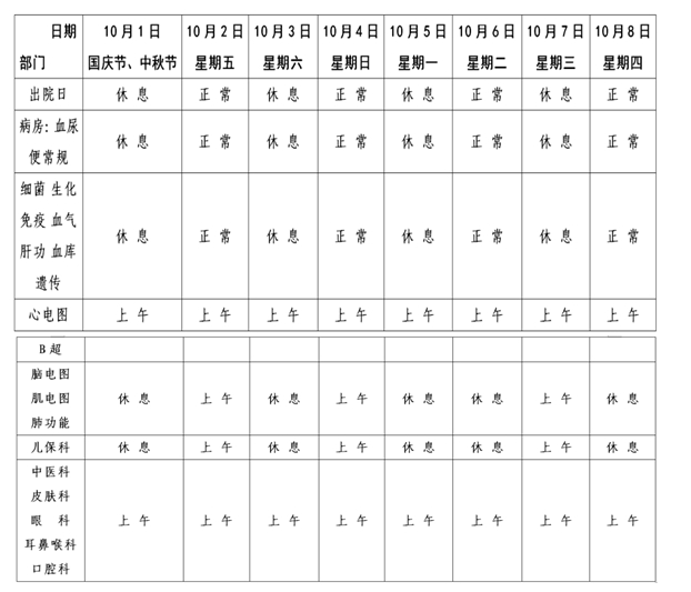 儿科门诊、中医门诊、疼痛门诊、胸外科门诊、普外科门诊、体检科、内科专家门诊10月1日~10月8日停诊。