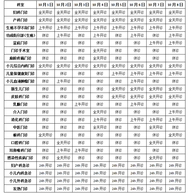 妇科门诊、口腔科门诊10月1日~10月3日停诊,10月4日~10月8日正常开诊。