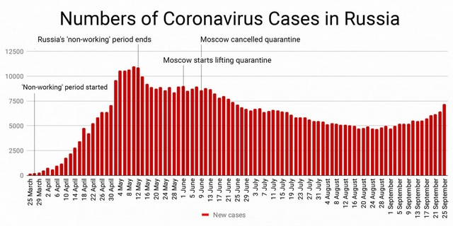 在俄罗斯国内,8月底9月初,单日确诊新冠肺炎确诊人数一度回落至5000以下,但自9月中旬以来,俄罗斯国内疫情有抬头趋势。根据俄罗斯新冠肺炎疫情防控指挥部的数据,9月26日录得的确诊人数为7523,是7月以来确诊病例最多的一天。目前,俄罗斯累计确诊病例超过114万例,累计死亡人数超2万人。