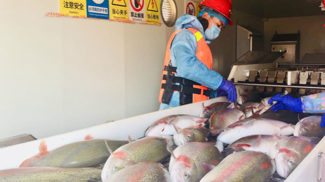 在民泽龙羊峡的工厂内,第一财经记者进一步看到,抵达工厂后的冰封三文鱼会经过流水线操作——开膛去内脏、清洗、根据重量自动分类、包装运输等。整个流水线仅10多位工人,大部分靠机器自动化操作。