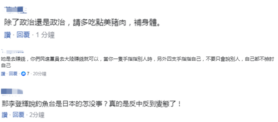 还有人称,“除了政治还是政治”“她是去赚钱,你们民进党员去大陆赚钱就可以,当你一个手指指别人时,另外四个手指指自己,不要只会说别人,自己都不检讨自己。”“李登辉说钓鱼岛是日本的怎么没事?正的是反中反到变态了!”