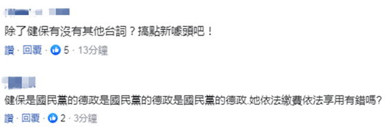 对于苏贞昌的说辞,有岛内网友在台媒评论区留言称,“除了健保有没有其他台词?搞点新噱头吧!”“她(欧阳娜娜)依法缴费依法享用有错吗?”