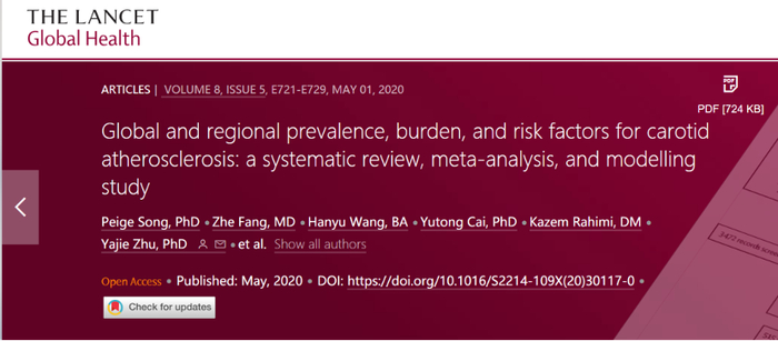 2020年5月,一项发表在《柳叶刀》子刊上由北京大学、帝国理工学院及哈佛大学学者共同参与的研究,对全球21个国家和地区人群的颈动脉粥样硬化患病率、患病人数和危险因素进行了评估,提出2020年全球有近20亿人颈动脉粥样硬化,且预计到2020年,有2.7亿国人有颈动脉粥样硬化,2亿人有颈动脉斑块。①