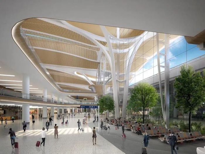 按设计规划,T3航站楼的拱形结构实现大跨无柱空间,室内高大宽敞,结合先进的智慧化出行设施,给旅客出行带来全新的出行体验。花园式的综合交通中心把交通与商业休闲设施结合起来,旨在打造一个充满活力、聚集人气的城市客厅。