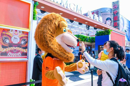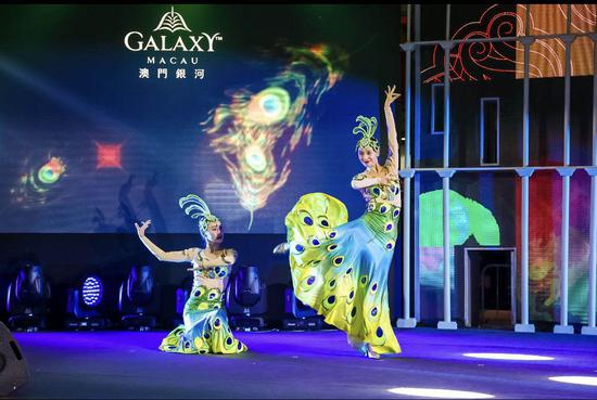 新京报记者在路演现场看到,美高梅在澳门旅游展区设置展位,以“传统和创新”、“实境和虚拟”以及“大国与小家”的结合为设计主题,介绍了美高梅旗下两家综合度假酒店的设施、餐饮以及艺术收藏等,现场还举办了传统的岭南醒狮表演。澳门银河豪华综合度假城也亮相路演现场,展位以度假城标志性的金色穹顶装饰为亮点,并进行了《如意孔雀舞》表演。澳门银河还针对内地游客推出了“买一送一”优惠活动。