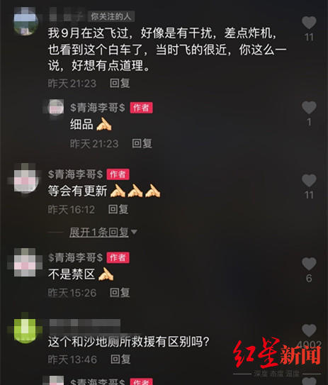 截至记者发稿时,该视频点赞量近20万,有近万人在该视频下方留言,有网友表示自己也遇到过这样的情况。据抖音用户“李_公子”留言称,9月他在此处飞过无人机,“好像是有干扰,差点‘炸机’,也看到这个白车了……”另一用户“皮卡哥”介绍,那辆白车是一个小伙出租无人机拍摄短视频用的,“我就让他拍过。”