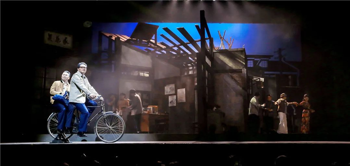 老弄堂里的半导体收音机响起怀旧的声音、电视荧屏里的“姚周”引发全场掌声、航拍俯瞰下的石库门变迁,展现时代发展……