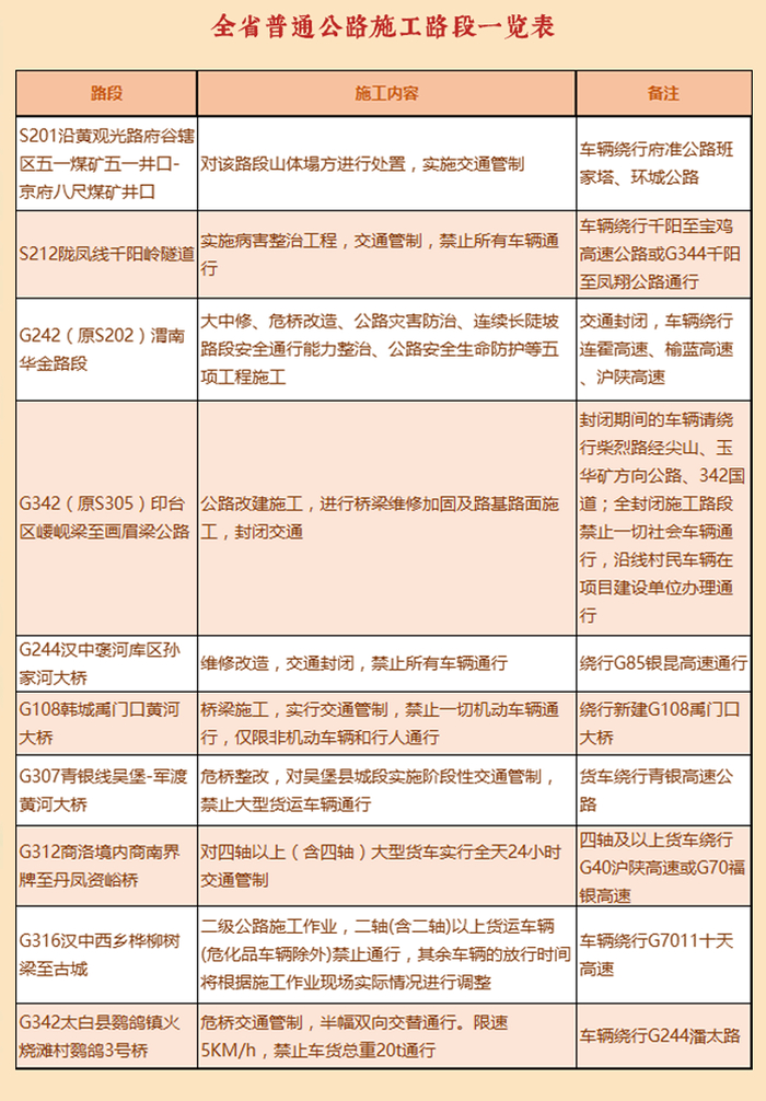 4、福银高速六村堡至礼泉段――经G312国道分流绕行。