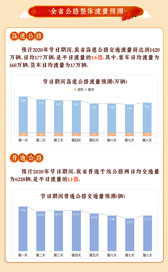 今年国庆中秋假期是我国抗疫斗争取得重大战略成果,疫情转入常态化精准防控与局部应急处置,生产生活秩序稳步恢复后的第一个长假。假日期间我省大部地区天气晴好,高速公路继续实行免费通行,群众出行意愿强烈,中长途自驾出游需求将集中释放,跨省、市出行剧增,出行车辆增多、距离增长、时间增加,部分高速、城市和景区周边道路将出现交通流大幅增长。