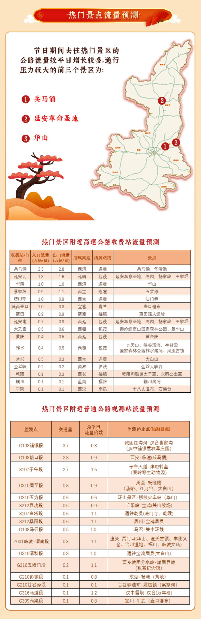 预计临潼华清池、兵马俑、翠华山、108国道临潼段、107省道沿途农家乐、峪口,眉县太白山、礼泉袁家村、华阴华山、富平爱国主义教育基地、宜川壶口瀑布、勉县武侯祠、铜川照金景区、泾阳乐华城、榆林红石峡、佳县白云山、延安壶口瀑布、宝塔山等景区、景点及周边道路,交通流量较大。