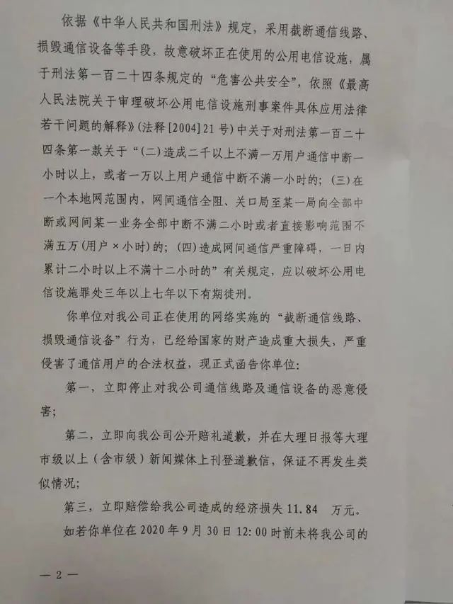 中国电信大理分公司同时还向满江街道办提出11.84万元的赔偿,并表示如果满江街道办事处不能在9月30日12时前将电信公司的各项要求履行到位,将保留向法院提起诉讼并追究你单位相关人员刑事责任的权利。