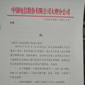 这份由中国电信股份有限公司大理分公司发出的“中电信大理函[2020]6号”文件称,9月25日12时20分许,电信大理分公司接到满江片区大量用户投诉,称无法进行正常通信。