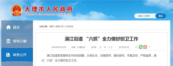 根据大理市政府官方网站信息,大理市目前正在进行创建国家卫生城市工作。7月16日,当地媒体《大理时讯》报道称,满江街道正紧紧围绕全市安排部署,从细从实、加强领导、强化宣传、丰富活动、严格督查,通过“六抓”全力做好创卫工作。