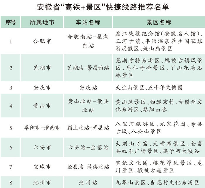 观黄山云海,品合肥美食,体验巢湖渔家生活,瞻仰泾县新四军旧址,朝拜九华山庙宇……由于沿线景点众多,合福高铁也被称作国内“最美高铁线”。以合肥为例,随着合福高铁的开通,市民可以用两个小时到更多城市。合福高铁穿越安徽、江西、福建三省,途经合肥南站、巢湖东站、铜陵北站、绩溪北站、歙县北站、黄山北站、婺源站、上饶站、武夷山北站、南平市站、古田北站、福州站等22个站点。线路所经区域分布着歙县、绩溪、福州等国家历史文化名城,以及世界文化遗产和自然遗产——黄山和武夷山,并分布有巢湖、三清山等19处国家级、省级风景名胜区。