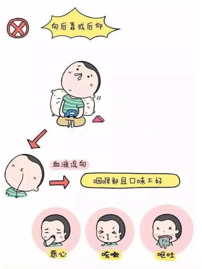 陈纯教授提醒,抬头后仰是一个常见的错误的处理方式。仰头并不能使出血停止,只是让鼻血换了一个流动的方向,抬头后仰使得鼻血顺着鼻腔往咽喉和食管倒流,最终被孩子咽到胃里去。一旦鼻血量比较大,孩子喉咙处感觉到血腥的气味,可能会惊慌失措,呛到咳嗽,孩子吞咽太多血也会让胃肠道受到刺激,容易发生腹痛、恶心、呕吐,甚至出现喷血、呕血吐血等症状。