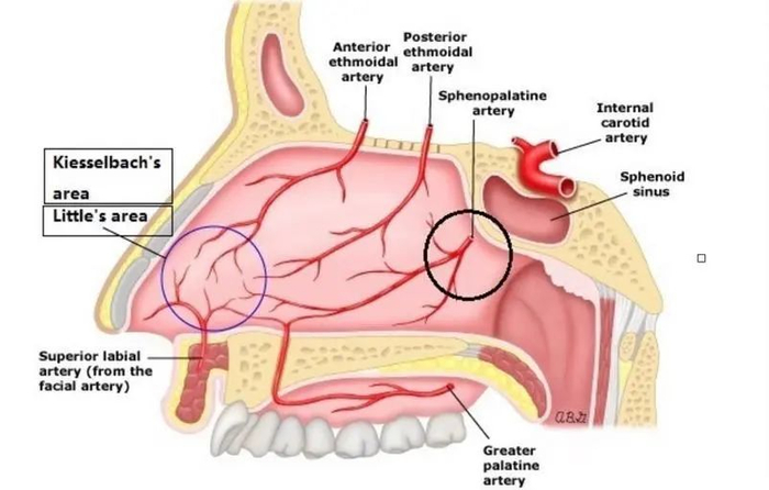 易出血区内有丰富的动静脉血管丛,但是鼻黏膜却很薄,因此血管极易损伤,且血管与软骨关系紧密,导致血管破裂后不易收缩、止血。