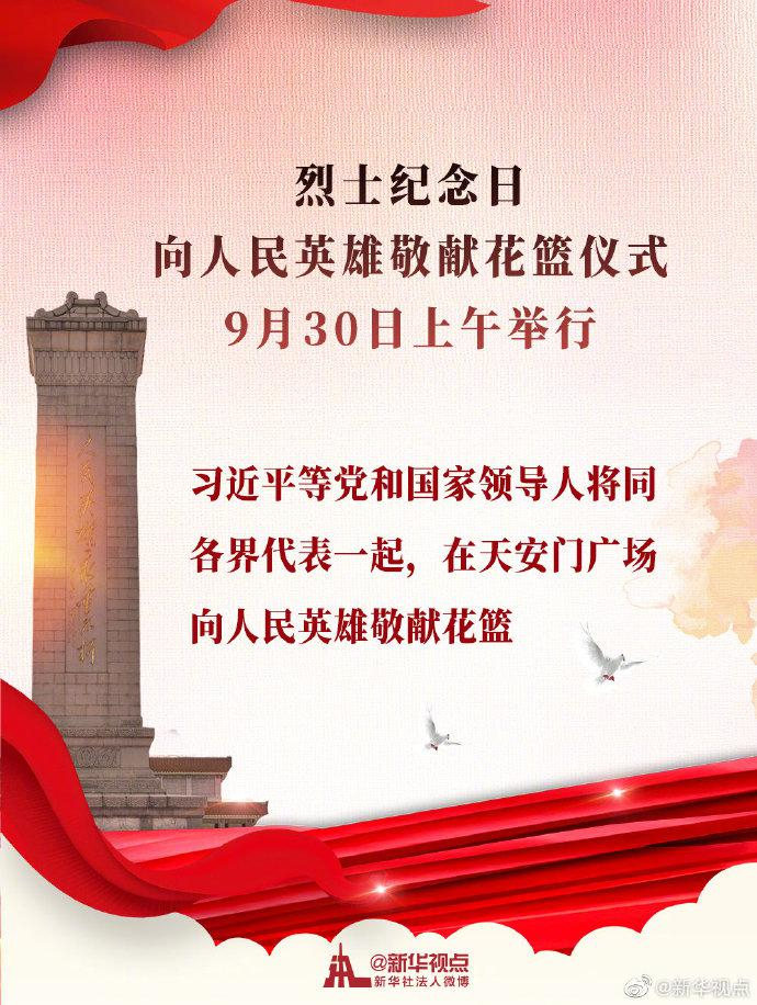 烈士纪念日向人民英雄敬献花篮仪式9月30日上午举行,习近平等党和国家领导人将同各界代表一起,在天安门广场向人民英雄敬献花篮。