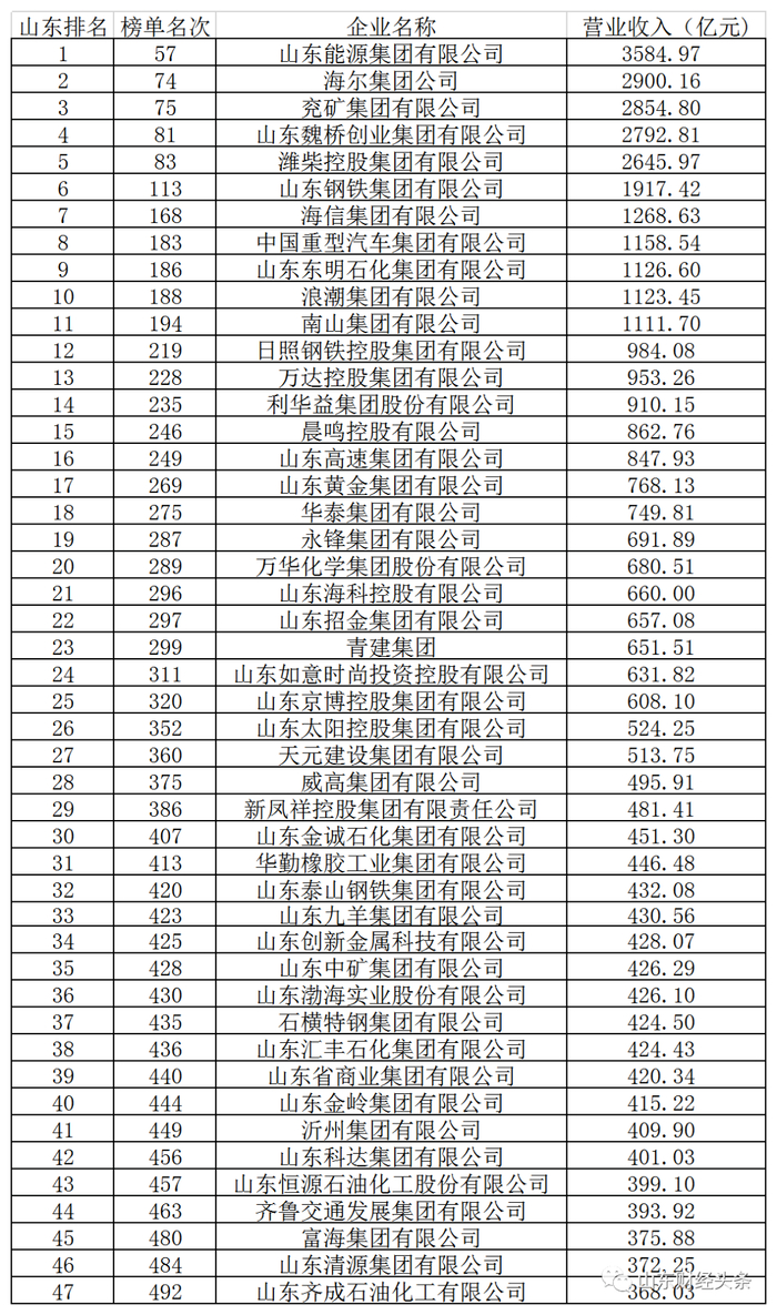 9月28日,中国企业联合会、中国企业家协会在郑州发布2020年中国企业500强名单。山东本次共有47家企业上榜,其中,原山东能源集团有限公司以3584.97亿元营收位居山东第一、榜单第57位。位居其后的是海尔集团公司与原兖矿集团有限公司,二者分别以2900.16亿元、2854.80亿元的营收位居榜单第74、75位。值得注意的是,山东省商业集团有限公司本次上榜,以420.34亿元的营收位居榜单第440位。(山东商报·速豹新闻记者 黄寿赓)