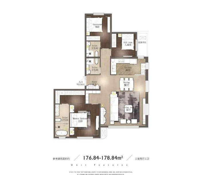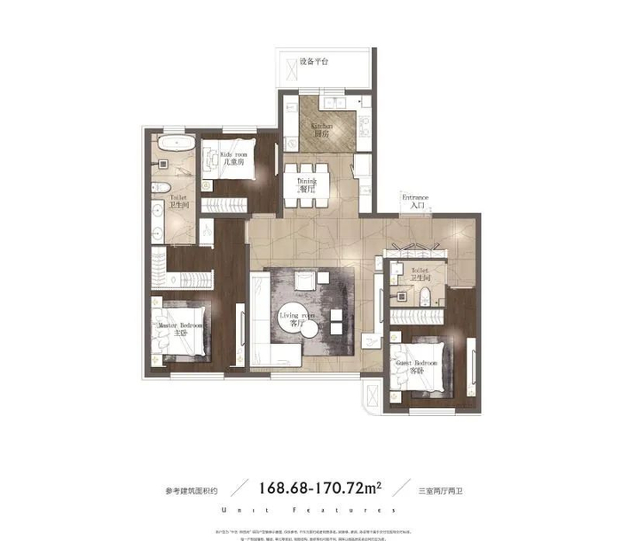 建面约150~320㎡阔府三居四居,和悦府南向套房式主卧,拥有独立私密的步入式衣帽间,其中部分主卧南北通透,匹配超大尺度的盥洗空间,最大化主人居住的舒适度;双梯双户、中西餐厨、明厨明卫、双厅联轴,一切都为龙江大家庭共享和悦之美而设计。