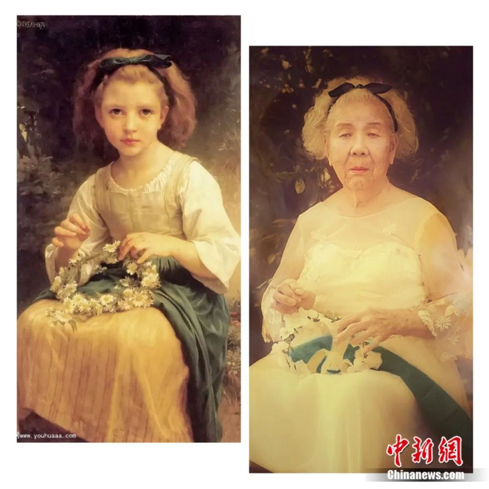 陈奶奶也是世界名画《编花环的女孩》的模仿者,照片中她身穿一袭白色纱裙,手捧花环,一头银发和《编花环的女孩》里的小女孩一般长短。“衣裳漂亮,人不漂亮。”奶奶“谦虚”地说。