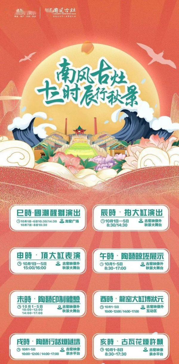 10月1日—8日在大盆行秋景舞台将上演十二时辰行秋景。10月1日—5日南风古灶则每天为大家带来八个精彩的传统技艺表演和活动。其中有“辰时·拍大缸”、“申时·顶大缸”、“戌时·龙窑大缸聚宝气”、“亥时·龙窑大缸博状元”、“巳时·国潮醒狮表演”、“戌时·陶艺行话灯谜墙”等。游客可以通过观看现场表演和参与活动领略这项传统技艺,体会文化传统。