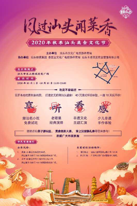 本次活动集结汕头最优秀的餐饮商家,以“美食+文化”的创新方式,打造最能代表汕头独特美食文化的崭新形象。活动除了提供丰富地道的美食之外,还连续8天献上精彩的潮汕特色文艺节目,包括非遗文化展示、潮汕民乐演奏、汕头元老帮乐队等。