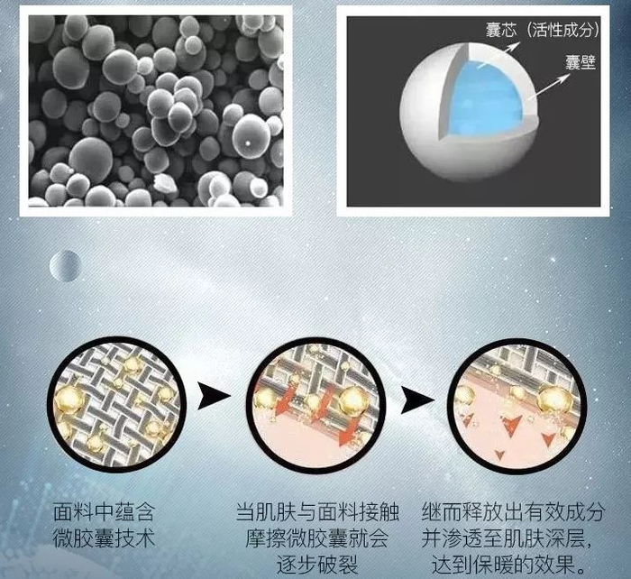 这么强的保温技术,在于面料里含有的微胶囊技术,蓄热调温就源于微胶囊中的相变材料。
