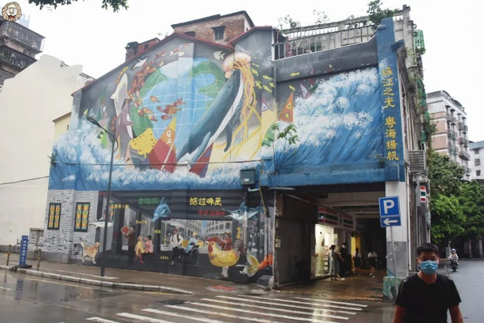 2018年,一面约160平方米的涂鸦墙出现在越秀区珠光街万福路198号骑楼,墙上绘有蓝色海洋、大鲸鱼、地球等。海洋底下是极具岭南风情的骑楼连廊,有西关小姐、东山少爷、黄包车、鸡公榄等广府文化元素,并加入了较多的粤语文化和术语、广州特定的生活场景。