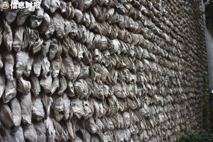 在古代加工技术还未成熟时,生蚝吃完后遗留下的壳基本上被集中起来,分门别类当作建筑材料来出售。在建造房屋时,生蚝壳拌上黄泥、红糖、蒸熟的糯米,一层层堆砌起来,不仅具有隔音效果,而且冬暖夏凉,坚固耐用,据说能抵挡枪炮的攻击。蚝壳墙凹凸不平,阳光斜射在墙面上,极具线条感和雕塑感。如今,记者在沙湾采访时看到,不少游人都喜欢在蚝壳墙前面拍照留念,在蚝壳墙前的小孙告诉记者:“我是北方人,我从来没有见过这么特别的墙,真的岭南这边的建筑很有特色,也很有智慧。”