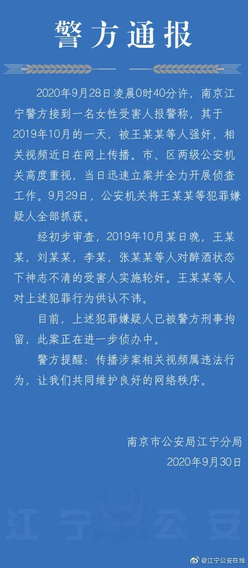 针对9月30日网传“江苏南京交通职业技术学院一女子遭三男子迷奸”一事,刚刚南京江宁警方官微回应称,9月29日,公安机关将王某某等犯罪嫌疑人全部抓获。经初步审查,2019年10月某日晚,王某某,刘某某,李某,张某某等人对醉酒状态下神志不清的受害人实施轮奸。王某某等人对上述犯罪行为供认不讳。目前,上述犯罪嫌疑人已被警方刑事拘留,此案正在进一步侦办中。