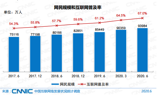 29日,中国互联网信息中心发布第46次《中国互联网络发展状况统计报告》,截至2020年6月,我国网民规模达9.40亿,较2020年3月增长3625万;我国手机网民规模达9.32亿,较2020年3月增长3546万,网民使用手机上网的比例达99.2%。