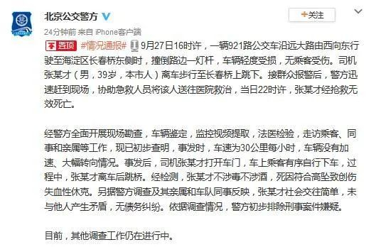 9月27日,北京市921路公交车一司机离车步行至长春桥上跳下,经抢救无效死亡。北京市公安局公共交通安全保卫分局官方微博29日发布通报称,依据调查情况,警方初步排除刑事案件嫌疑。