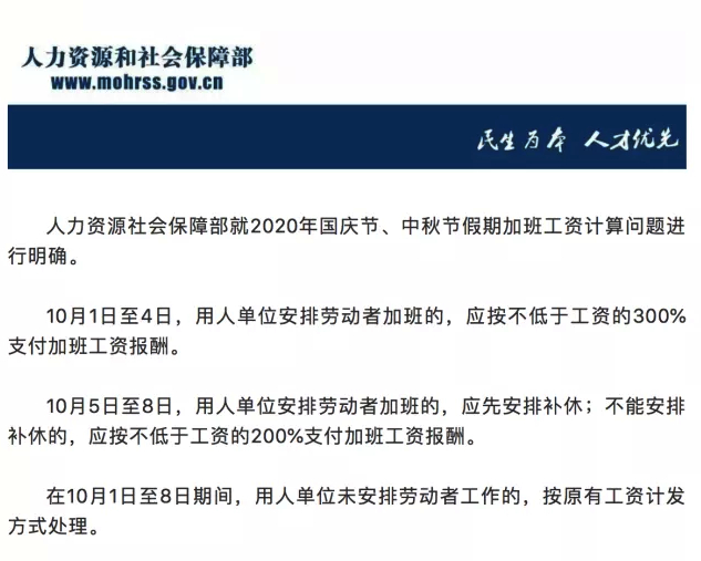 答:没有!人力资源和社会保障部已经明确,10月1日至4日按照法定节假日标准支付加班工资,10月1日安排劳动者加班,用人单位应当支付不低于300%的工资。