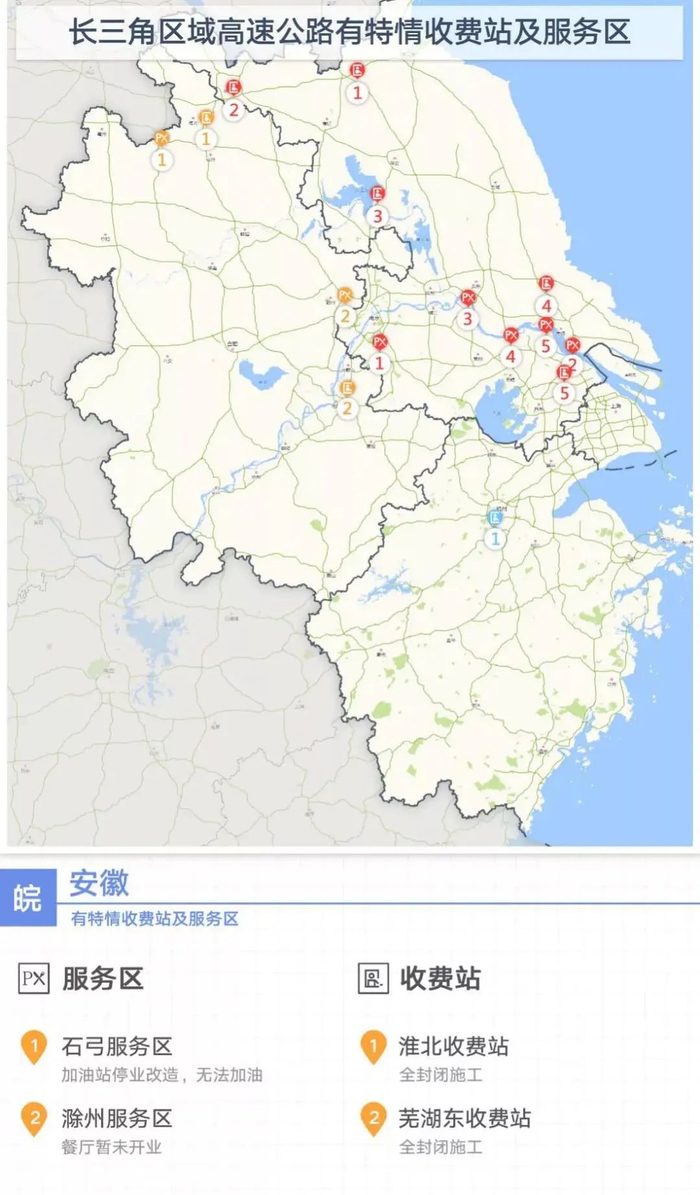 节日期间,长三角区域高速公路除了浙江全省无施工区段外,上海、江苏及安徽仍有个别路段施工,收费站及服务区方面,上海、江苏、浙江全路网收费站正常开放,安徽的淮北收费站及芜湖东收费站全封闭施工。服务区方面,上海路网所有服务区正常运营,江苏部分服务区关闭或暂停加油、停车位减少,浙江西湖服务区双向关闭改造施工,安徽石弓服务区无法加油、滁州服务区餐厅不开业,请途经施工路段的驾驶员注意施工现场交通标志提示,保障安全行车。