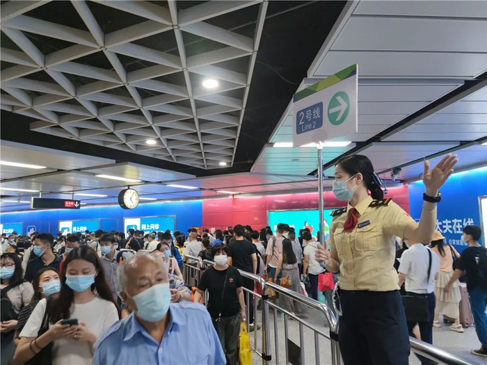 十一假期客流较大,请乘客再出行过程中及时关注车站广播和告示、地铁电视、官方微信微博等发布的客流引导相关信息,低峰、错峰出行。同时,请广大乘客自觉做好个人防护,搭乘地铁时,请主动出示穗康码(粤康码),配合测温及安检,并全程佩戴好口罩。