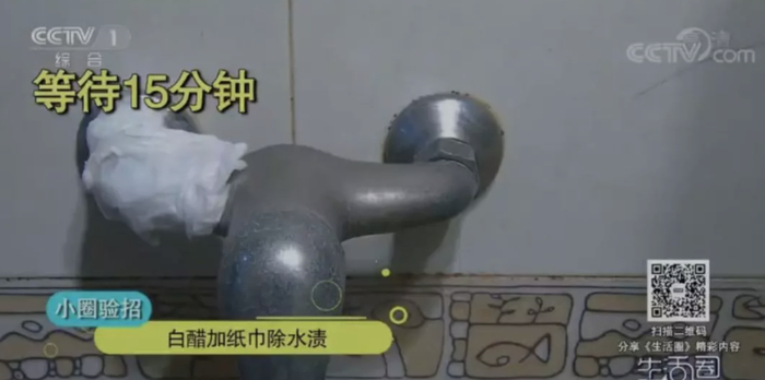然后把纸巾包裹在有水垢的水龙头上,将有水垢的地方完全包住,静置15分钟;