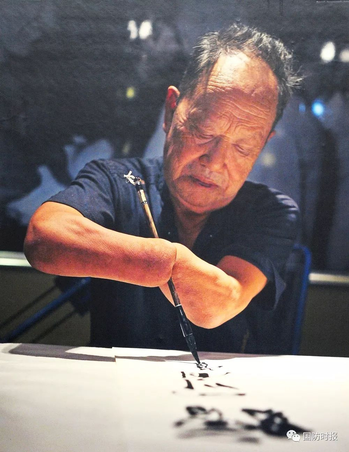 断臂伤残老军人抱笔书法