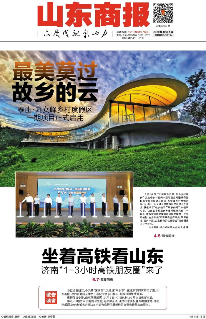 泰山九女峰乡村度假区项目是鲁商集团、省国欣文旅集团首个签约并投入建设的乡村振兴项目,位于泰安市岱岳区道朗镇,涉及19个村、1.3万人,计划总投资20亿元,由国内著名规划设计团队整体规划设计,整个片区将分三期完成。今年3月19日正式开工,仅用时6个多月,就完美呈现了“故乡的云”“故乡的月”、八楼氧心谷、山东省乡村振兴齐鲁样板研究院(一期),并于今天正式投入运营。