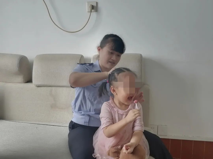 这两个孩子是一对兄妹,来到邕武派出所将近一个星期。10月1日上午,在派出所二楼,两个小家伙丝毫不怕生。女民警许媛媛一边帮4岁的小女孩小恩(化名)绑头发,一边不忘叮嘱正在沙发上活蹦乱跳的小翔(化名)注意安全。过了一会,两个孩子又在临时拼凑而成的沙发床上玩耍。