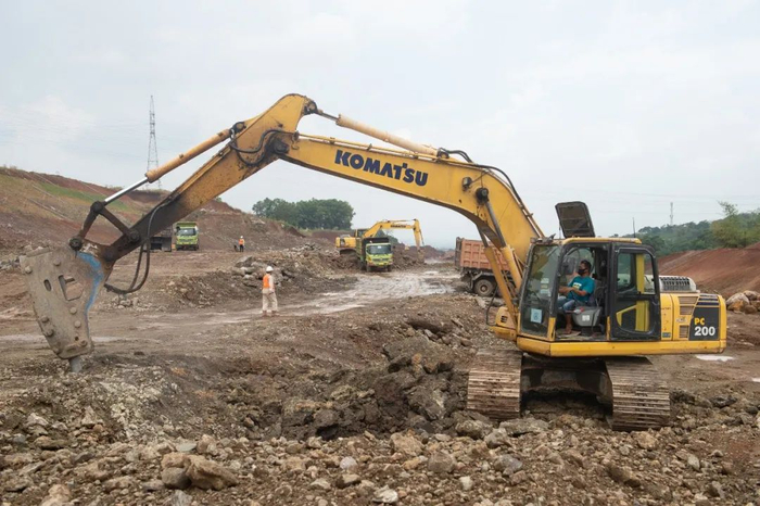 8月14日,在位于印度尼西亚西爪哇省省会万隆附近的双木丹,印尼万隆高速公路三期项目的工人戴着口罩操作挖掘机施工。新华社记者 杜宇 摄